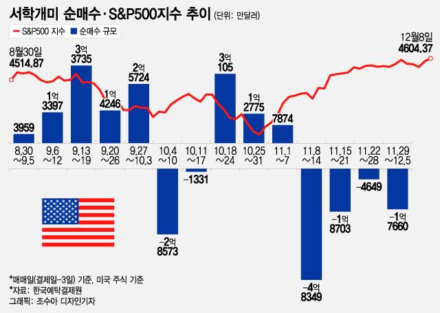 한국예탁결제원에 따르면 서학개미들은 지난 11월29일~12월5일(결제일 기준 지난 4~8일) 사이에 미국 증시에서 1억7660만달러의 매도 우위를 나타냈다.