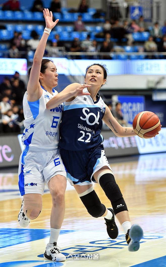 신한 구슬이 11일 인천 도원체육관에서 열린 2023-2024 WKBL 신한은행과 우리은행의 경기에서 우리 최이샘 마크를 받으며 골밑슛을 시도하고 있다. 2023.12.11. 인천 | 강영조기자 kanjo@sportsseoul.com