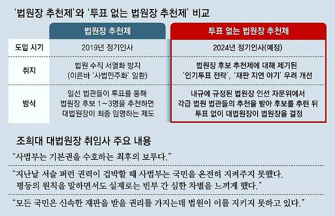 결국 조 대법원장은 이런 부작용을 막기 위해 투표제를 폐지하는 방안을 검토 중이다. 이 경우 일선 법원별로 법원장 후보자를 추천받는 게 아니라 전국 단위로 후보군을 추리는 방안이 유력하게 거론된다.