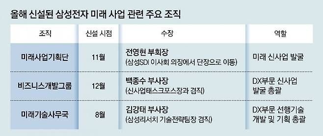 삼성전자가 지난달 사장단 인사에서 미래사업기획단을 신설한 데 이어 디바이스경험(DX)부문에 비즈니스 개발그룹을 만들었다.