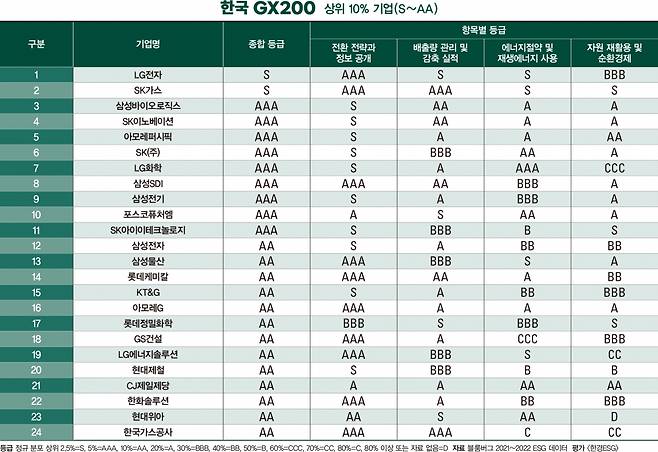 올해 평가에서 종합 S 등급을 받은 기업은 LG전자와 SK가스 두 곳이다. AAA 등급은 9곳, AA는 13곳, A는 42곳이 획득했다. 전환 전략과 정보공개 부문은 절대평가를 실시해 9곳이 S 등급을 받았다. 나머지 배출량 관리 및 감축 실적에서 4곳, 에너지절약 및 재생에너지 사용 부문에서 7곳, 자원 재활용 및 순환경제 부문에서는 4곳이 S 등급을 받았다.