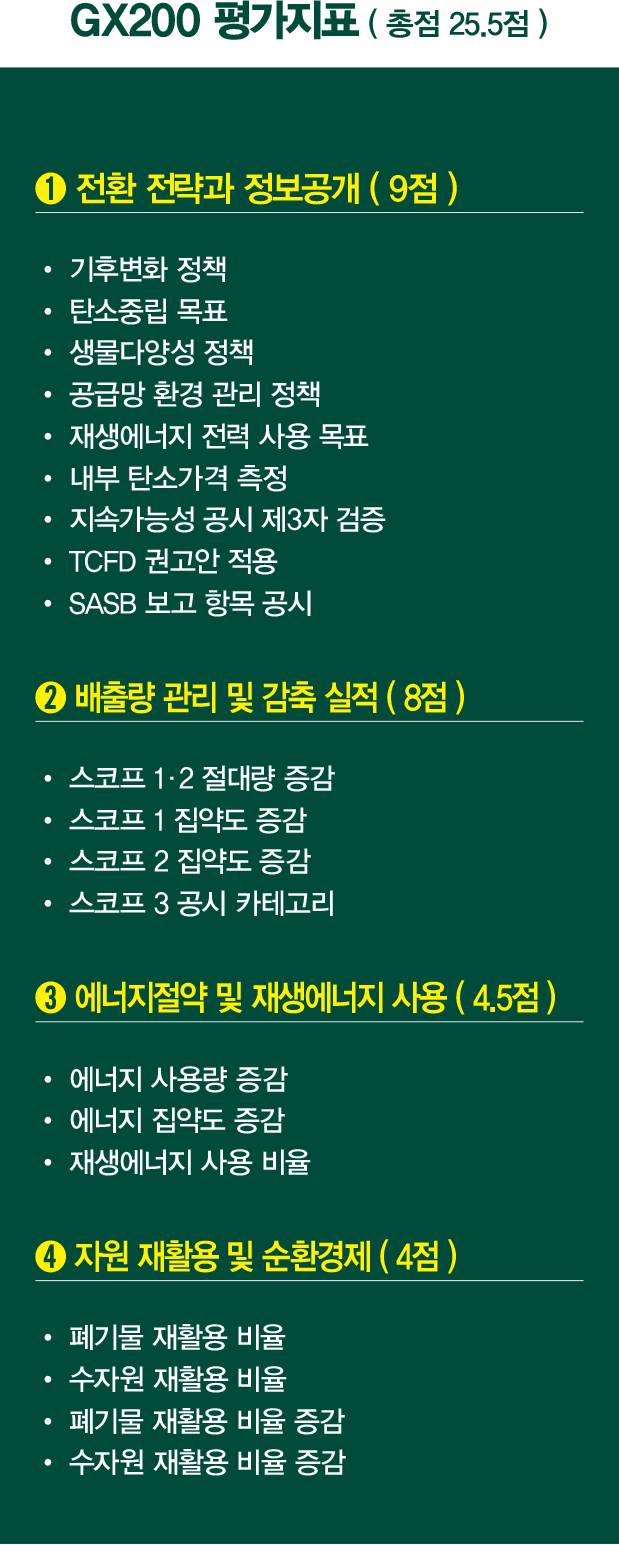 에너지절약 및 재생에너지 사용 부문은 에너지 사용량 감축 비율, 매출 대비 에너지 집약도 감축 비율, 전체 에너지 사용량 대비 재생에너지 사용 비율 등을 점검했다. 자원 재활용 및 순환경제 부문은 폐기물과 수자원 재활용 비율, 수자원 사용량 감소 비율, 폐기물 재활용 증가 비율 등을 평가에 반영했다. 두 부문 배점은 8.5점으로, 전체 총점은 25.5점이다.