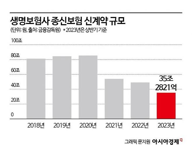 실제로 금융감독원에 따르면 생보사들의 종신보험 신계약 금액은 2018년 81조2029억원에서 2020년 85조4047억원까지 증가하며 꾸준히 80조원대를 유지했다. 하지만 이듬해부터 53조9060억원으로 급격히 떨어졌다. 지난해에는 49조1315억원으로 2020년 대비 42.5% 하락했다. 올해 상반기에는 35조2821억원으로 다소 회복했지만 이는 보험사들이 새 수익성지표 계약서비스마진(CSM)을 늘리기 위해 '단기납' 종신보험 판매를 급격히 늘린 영향으로 풀이된다.