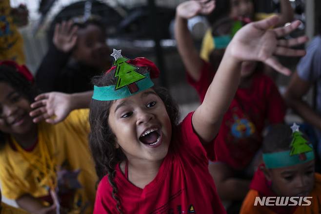 [리우데자네이루=AP/뉴시스] 11일(현지시각) 브라질 리우데자네이루의 한 학교에서 비정부기구(NGO)가 주최한 크리스마스 행사가 열려 어린이들이 '블랙 산타' 분장을 한 남성을 보며 환호하고 있다. 최근 몇 년 동안 '블랙 산타'는 크리스마스 행사를 통해 빈민가 아이들에게 문화적 현실을 더 잘 반영하는 크리스마스 캐릭터로 소개되고 있다. 2023.12.12.