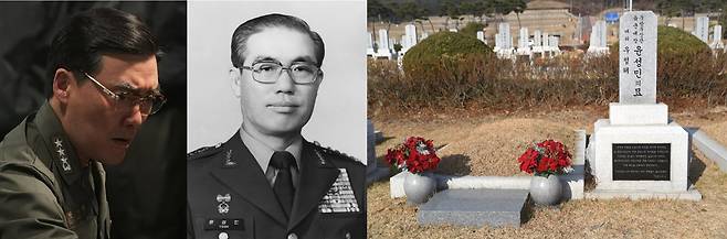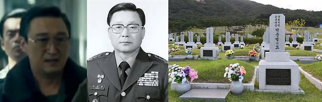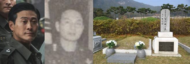 | ▲ <서울의 봄>에서 민성배 역을 맡은 배우 유성주, 윤성민 육군참모차장, 윤성민 장군의 묘역(좌측부터) |