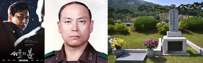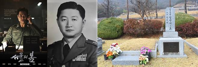| ▲ <서울의 봄>에서 박기태 역을 맡은 배우 이기훈, 김기택 수경사 참모장, 김기택의 묘(좌측부터) |