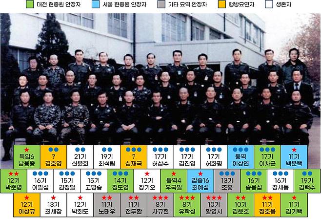 | ▲ 34인의 12.12 군사반란 관련 신군부 인사들의 육사 기수, 당시 계급, 생존 여부 및 안장정보 |