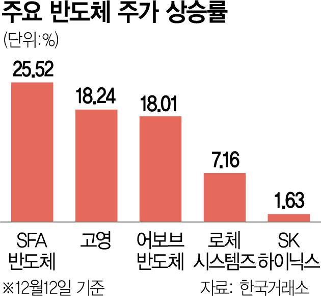 12일 한국거래소에 따르면 반도체 패키징 업체인 SFA반도체(036540)는 전 거래일 대비 1340원(25.52%) 오른 6590원에 마감했다. 반도체 검사 장비 업체인 고영(098460)(18.24%), 마이크로컨트롤러유닛(MCU) 반도체 설계(팹리스) 업체인 어보브반도체(102120)(18.01%), 반도체 장비주인 로체시스템즈(7.16%) 등 코스닥에 상장된 다른 중소형주도 초강세를 보였다.