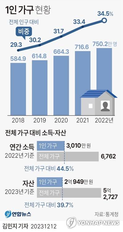 (서울=연합뉴스) 김민지 기자 = 12일 통계청이 발표한 '통계로 보는 1인가구'에 따르면 지난해 기준 1인 가구는 750만2천가구로 우리나라 전체 가구(2천177만4천가구)의 34.5%를 차지하는 것으로 집계됐다.