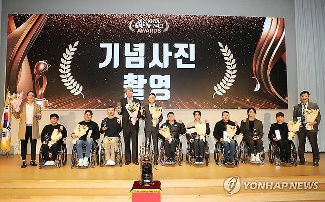 (서울=연합뉴스) 12일 오후 서울 송파구 올림픽파크텔에서 열린 2023 KWBL 휠체어농구리그 시상식에서 수상자들이 기념 촬영을 하고 있다. 2023.12.12 [한국휠체어농구연맹 제공. 재판매 및 DB 금지]