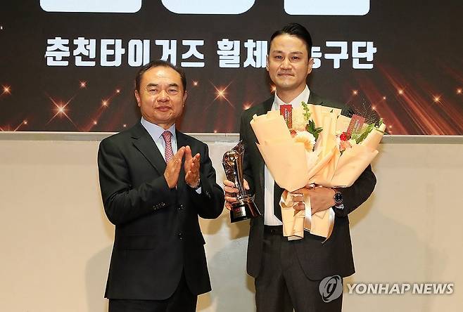 (서울=연합뉴스) 12일 오후 서울 송파구 올림픽파크텔에서 열린 2023 KWBL 휠체어농구리그 시상식에서 MVP를 수상한 춘천 조승현이 시상자 최욱철 KWBL 총재외 기념촬영을 하고 있다. 2023.12.12 [한국휠체어농구연맹 제공. 재판매 및 DB 금지]