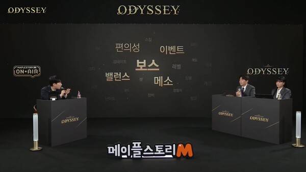 12일 메이플스토리M 오딧세이(Odyssey) 쇼케이스을 진행한 김현승 디렉터와 이사라 기획팀장은 "작년 10월 처음 방송을 시작했는데 벌써 네 번째 방송이다. 너무 떨린다. 업데이트 준비에 매진하느라 방송으로 직접 소통하지 못했지만 커뮤니티로 접수되는 의견을 열심히 확인했다. 이 자리에서 그동안 궁금했던 것들과 신규 업데이트 소식를 전할 예정이니 많이 기대해 달라"며 방송을 시작했다.