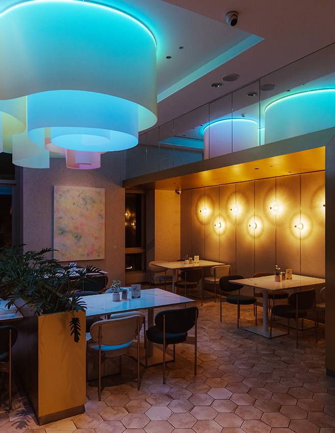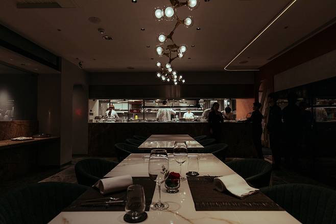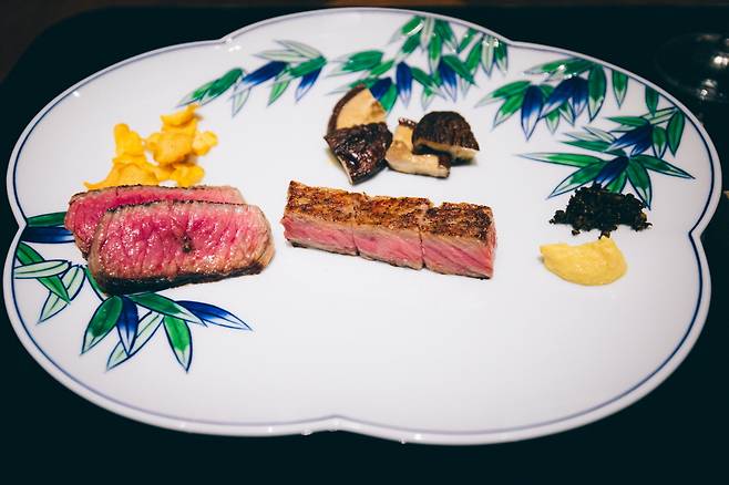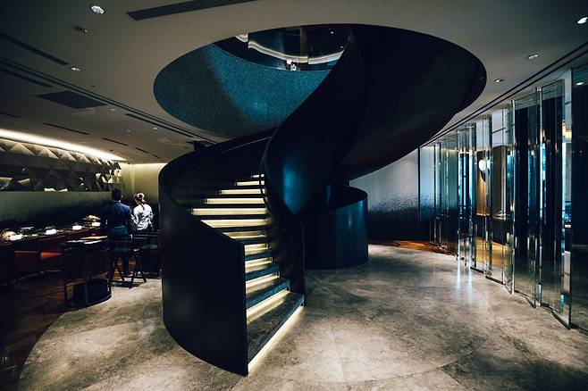 레스토랑 내부로 들어서면 묵직하고 절제된 원형 계단이 가장 먼저 눈에 띈다. 계단을 따라 내려가면 은색 철판이 보인다. 데판야끼의 묘미는 철판 위에서 능숙하게 조리되는 질 좋은 재료를 직접 구경하는 것이다. 계절에 맞는 재료를 셰프의 기술로 조리하고, 완성된 음식을 일본 아리타현의 도자기로 마무리한다. 좋은 재료, 완벽한 조리기술, 미학적인 접시.