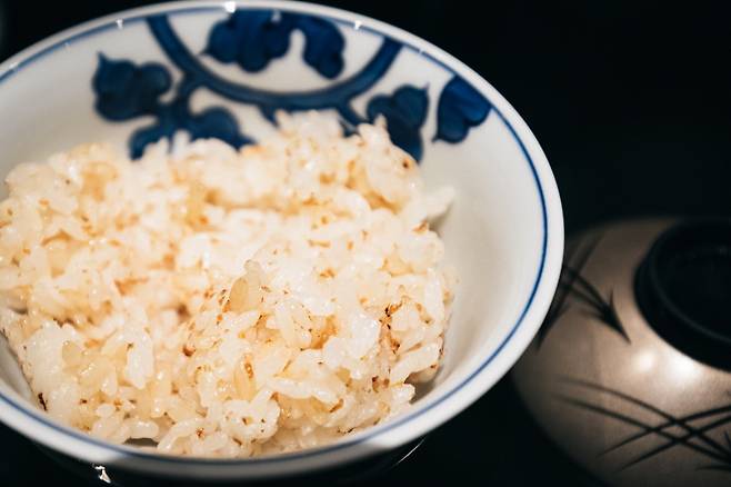 데판야끼 코스의 꽃은 마늘과 밥, 단 2가지의 재료로 완성하는 마늘볶음밥이다. 단 한 방울의 기름도 두르지 않고 볶아 낸다. 우카이테이에서 마늘볶음밥은 도정된 지 반년 이내의 쌀만 사용한다. 사계절마다 물 조절을 다르게 해 밥을 짓는다. 밥을 넓게 펼쳐 구워 내고, 이후에 밥을 높게 쌓아 쪄 내는 방식으로 마무리한다. 다채로운 셰프의 손놀림에 한 번 넋이 나가고, 맛에 두 번 넋이 나간다.