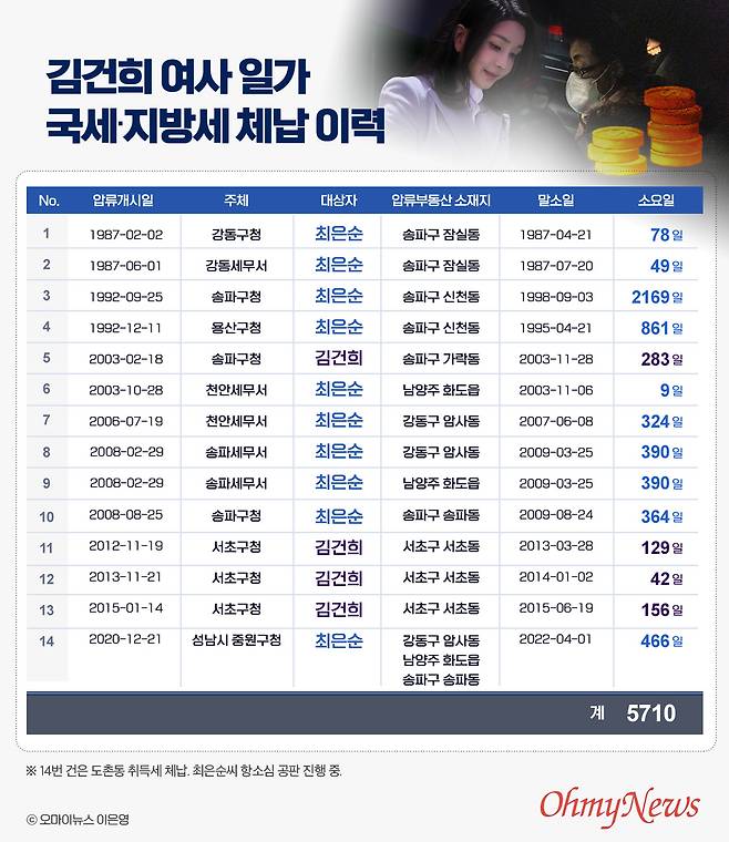 1974년 이후 김 여사 일가가 거주 혹은 소유했거나 현재 보유하고 있는 관련 부동산 등기부등본 144부를 확인한 결과, 국세청 관할 세무서와 지방자치단체, 건강보험공단이 세금 체납과 과징금 미납 등을 이유로 42회(압류번호 기준) 압류를 통보한 사실이 드러났다. 해당 부동산들은 38곳으로 전국 규모로 분포돼 있었다. 서울 강동구와 송파구 건물을 비롯해, 경기 양평군 병산리, 경기 남양주시 금남리, 강원 동해시, 충남 당진 등 토지가 압류 대상이었다.