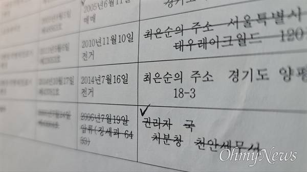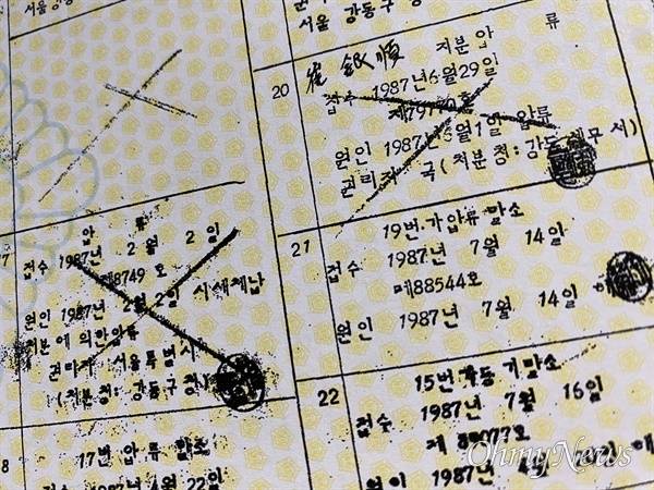 최씨가 처음 압류를 당한 시기는 1987년 2월이다. 서울시 강동구청(현 송파구청)은 시세 체납 처분을 근거로 최씨 소유의 송파구 잠실동 223-O를 압류했다. 시세 체납은 서울시 지방세를 기한까지 납부하지 못했다는 의미다. 해당 토지와 동소 건물은 네 달 후인 1987년 6월, 국세 체납을 이유로 강동세무서에 또 압류 당했다.