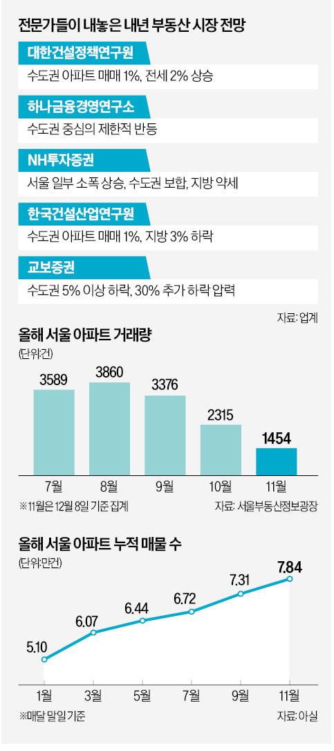 아파트 가격 흐름이 하락세로 돌아선 가운데 전문가들은 내년 집값에 대해 엇갈린 관측을 내놓고 있다. 대한건설정책연구원은 내년 수도권 아파트 매매가격이 1% 안팎 상승할 것으로 내다봤다. 수도권 아파트 전셋값은 2% 오를 것으로 예상했다.