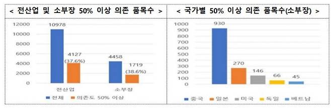 국내 소부장 수입품목 4458개 중 수입액 100만 달러 이상, 특정국 수입의존도 50% 이상 품목은 2022년 기준 1719개에 달한다. 이는 주요국(G7) 대비 중간재 및 특정국 수입의존도가 가장 높은 수준으로 글로벌 공급망이 흔들릴 때마다 우리 경제의 취약성을 드러냈다. 국가별 50% 이상 의존 품목 수는 중국이 930개로 가장 많으며 일본 270개, 미국 146개, 독일 66, 베트남 45개 순이다.