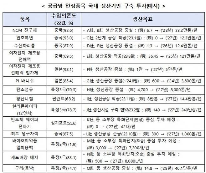정부는 수입 의존도, 산업 영향 등을 고려해 반도체 희귀가스, 흑연, 희토 영구자석, 요소 등 185개 공급망 안정 품목을 선정하고 이들 품목의 특정국 의존도를 2022년 평균 70%에서 2030년까지 50% 이하로 낮출 계획이다.