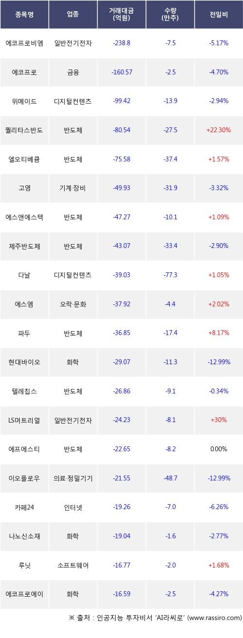 외국인 투자자의 순매도 상위 20개 종목은 에코프로비엠, 에코프로, 위메이드, 퀄리타스반도체, 엘오티베큠, 고영, 에스앤에스텍, 제주반도체, 다날, 에스엠등이다.