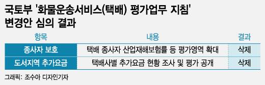 13일 관계부처에 따르면 국조실 규개위는 최근 국토교통부 '화물운송서비스(택배) 평가 업무 지침 개정안'을 심의한 결과, 정부의 도서 지역 추가요금 직접 평가 기준 등을 '택배 서비스 평가제도'에서 모두 삭제하도록 권고했다. 정부가 택배사들의 운임을 조사해 평가하는 것은 지나친 시장 개입이라는 것이다. 규개위원은 "정부가 가격을 직접 평가하는 것은 시장의 가격에 정부가 개입하는 것으로, 과도한 규제로 판단된다"고 설명했다.