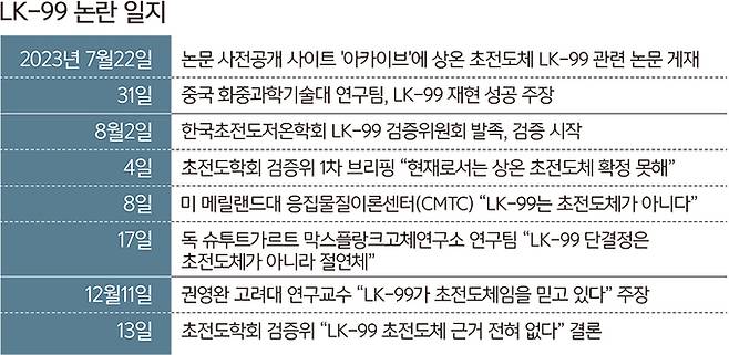 지난 7월 논문 사전공개사이트 ‘아카이브’에 LK-99에 관한 논문이 올라왔다. 퀀텀에너지연구소 등 국내 연구진은 납과 인회석 결정 구조인 LK-99가 섭씨 127도에서 초전도 현상이 관측됐다고 주장했다. ‘꿈의 물질’인 상온·상압 초전도체 개발 소식에 전 세계가 들썩였다. 그러나 상온·상압 초전도체는 결국 해프닝에 그쳤다.