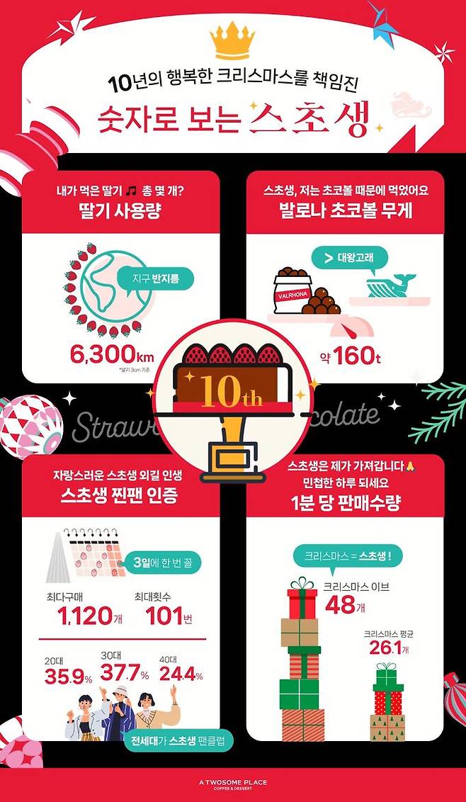 투썸플레이스 관계자는 “스초생은 기념일을 축하하는 홀케이크의 대표주자를 넘어, ‘떠먹는 케이크’, ‘마시는 스초생’ 등 다른 타입으로도 출시됐을 만큼 10년간 고객의 무한한 사랑을 받아온 제품”이라며, “스초생의 10번째 크리스마스인 올 시즌에도 진한 달콤함과 상큼함으로 즐거움이 가득한 시간 보내시길 바라며, 앞으로도 스초생과 함께할 다양한 순간들을 기대해주시길 바란다”고 전했다.