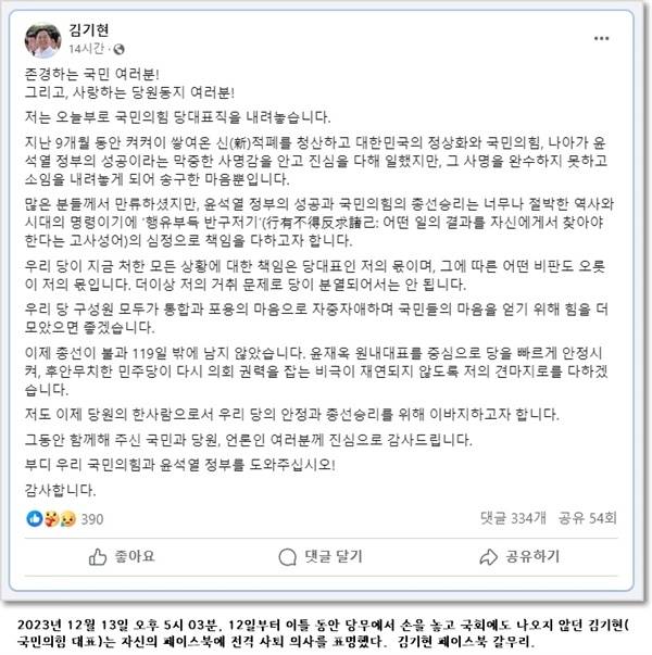 | ▲ 페이스북을 통해 당대표 사퇴 의사를 표시한 김기현(국민의힘 대표). |
