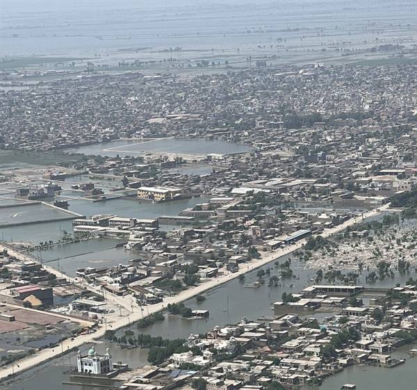 | ▲ 2022년 파키스탄 대홍수. 2022년 9월 홍수로 뒤덮인 샤흐다드코트 시내의 조감도. |