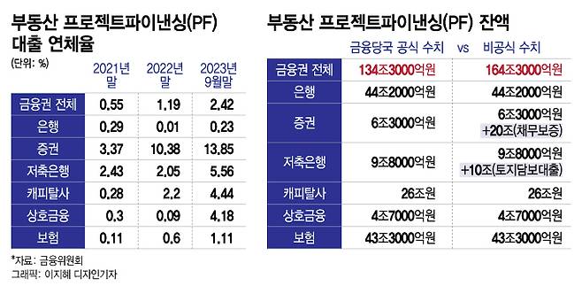 저축은행 사태가 벌어진 2011년 저축업권 PF대출 연체율은 13%였다. 지난 9월말 기준 저축은행 PF 연체율은 5.56%로 아직은 여유가 있지만 2021년 말 1.22% 대비 4%포인트 넘게 올랐다. PF 대출과 사실상 동일한 토지담보대출은 대주단협약 개시 전 기준 연체율이 10%대를 기록한 것으로 전해진다. 금융권 전체 PF 연체율은 9월말 기준 2.42%로 2021년 말 0.37% 대비 2%포인트 넘게 상승했다. 증권사의 경우 PF 규모는 크지 않지만 연체율이 13.85%로 이미 위험수위다. 캐피탈사와 상호금융권도 각각 4.44%, 4.18%로 2021년 0.47%, 0.09% 대비 크게 오른 상황이다.