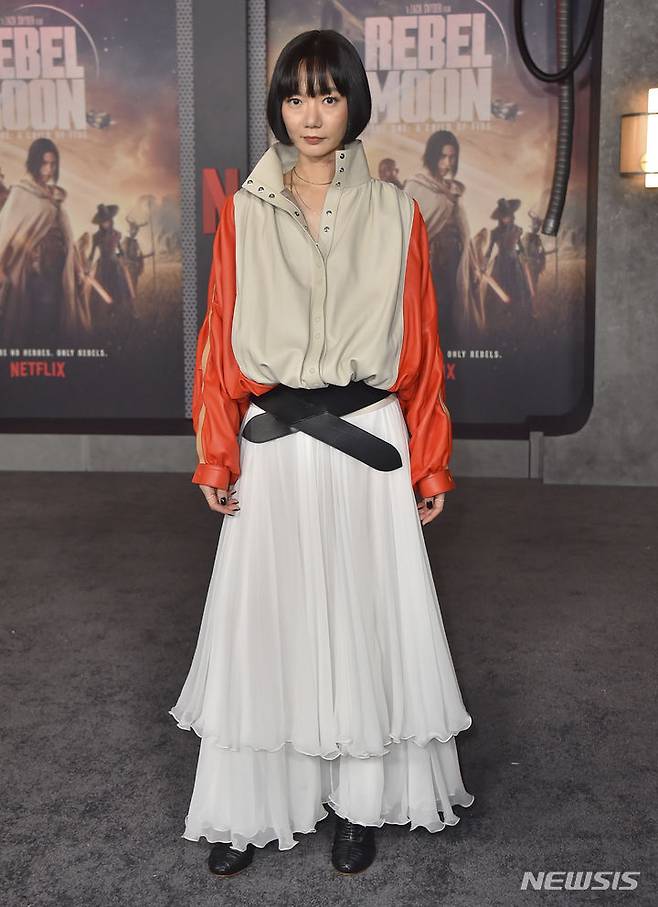 [로스앤젤레스=AP/뉴시스] 배우 배두나가 13일(현지시각) 미 캘리포니아주 로스앤젤레스의 TCL 차이니즈 극장에서 열린 넷플릭스 영화 '레벨 문: 파트1 불의 아이' 시사회에 참석해 포토타임을 갖고 있다. 2023.12.14.
