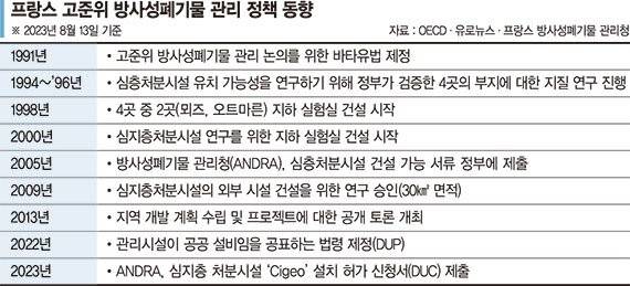 '시제오'로 불리는 프랑스의 방폐장 프로젝트는 2025년 건설을 시작, 2035년 운영을 목표로 하고 있다. 해당 시설의 목표 운영기간은 약 100년으로, 운영이 종료되면 모든 시설을 폐쇄하고 지속모니터링하는 등 사후관리를 할 예정이다. 안드라는 지난 1월 원자력안전청에 처분장 건설허가 신청서를 제출했다. 다만 환경운동가들과 지역 주민들의 강력한 반대에 부딪혀 원자력안전위원회의 승인도 아직 나오지 않은 상태다. 따라서 프랑스의 방폐장 승인 여부는 아직 불투명한 상태다.
