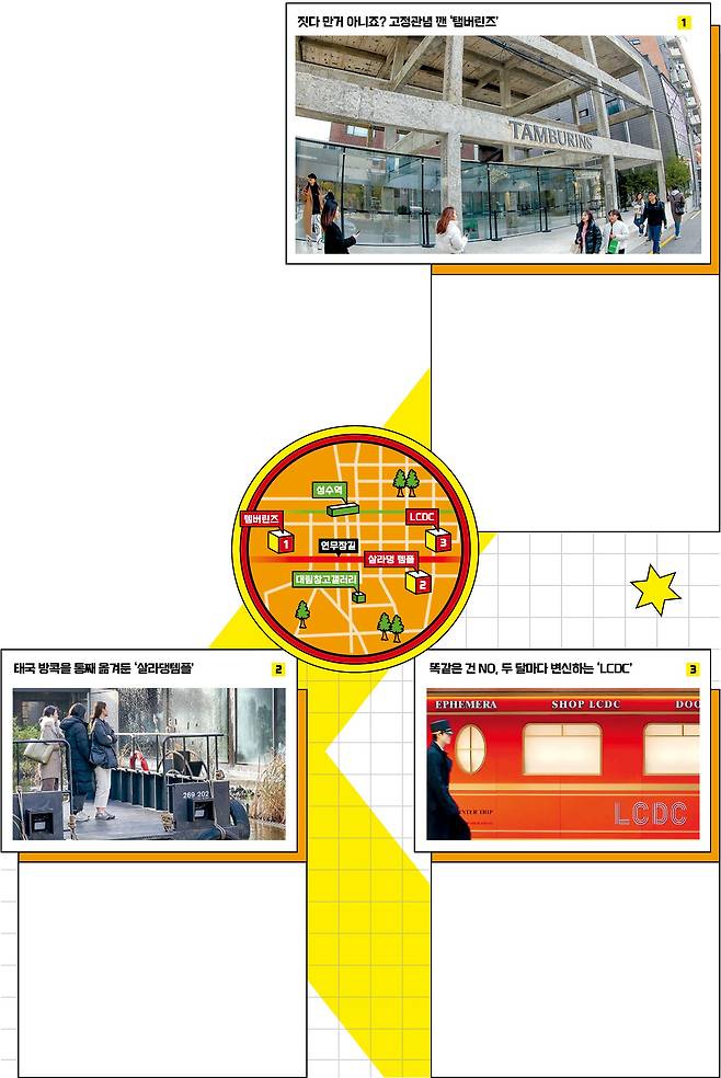 고객에게 식상할 겨를을 주지 않는 ‘빠른 변화’도 성수동의 키워드 중 하나다. 살라댕템플에서 골목 하나만 건너면 나오는 문화공간 LCDC를 찾으면 무슨 얘기인지 알 수 있다. LCDC도 텅 빈 주차장 부지에 세운 3층짜리 복합문화공간이다.