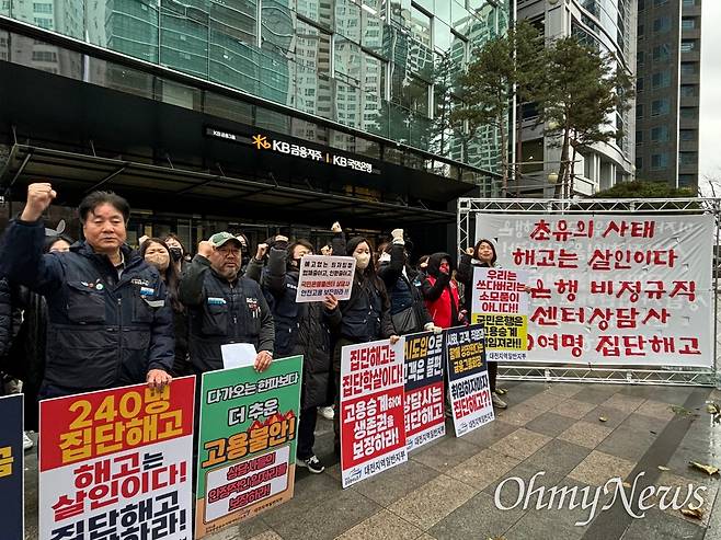| ▲ 국민은행 비정규직 상담사 등 30여 명이 11일 오전 서울 영등포구 여의도 국민은행 신관 앞에서 비정규직 상담사 240여 명 집단해고 규탄 기자회견에서 구호를 외치고 있다(자료사진). |