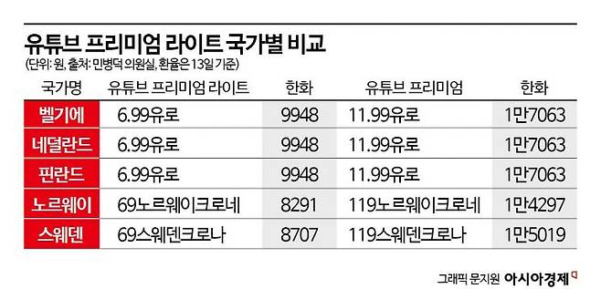 일부 유럽 국가에서는 유튜브 뮤직을 빼고 광고 제거 등 기본 기능만으로 구성된 '유튜브 프리미엄 라이트' 요금제를 저렴하게 이용할 수 있다. 스웨덴의 경우 69스웨덴크로나(8707원)이다. 유튜브 뮤직을 더한 '유튜브 프리미엄'의 119스웨덴크로나(1만5019원)에 비해 43% 저렴하다. 덴마크·노르웨이·핀란드·벨기에 등도 프리미엄 요금제의 반값 수준에 이런 요금제를 이용할 수 있다.