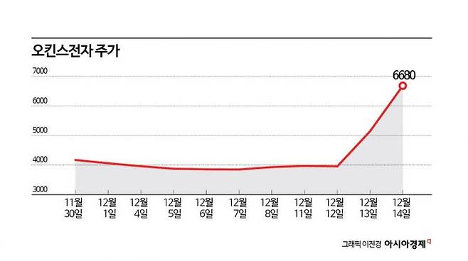 15일 한국거래소에 따르면 오킨스전자는 최근 이틀 연속 상한가를 기록했다. 주가는 지난 12일 3955원에서 14일 6680원으로 이틀 만에 68.9% 올랐다.