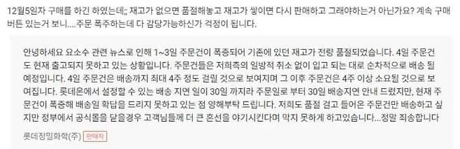 이에 롯데정밀화학 홍보담당자는 14일 <오마이뉴스>에 "정부에서 그런(품절 표시하지 말라는) 요구는 없었다"면서 "공식 쇼핑몰 운영을 맡은 협력사 직원이 실수로 올린 내용"이라고 밝혔다.