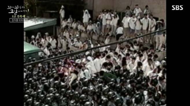 아이들은 무작정 교문과 전경들을 뚫고 나갔어. 이렇게 아이들은 법원으로 향하는 서너 갈래 길로 무리를 지어 흩어졌어. 전경들은 일단 아이들을 무력으로 저지하기 시작했어. 방패로 밀치거나 곤봉을 휘두른 거야. 그 결과 곳곳에서 부상당한 아이들이 속출했어. 심지어 말리려고 끼어든 한 어머니는 머리를 맞아서 피투성이가 되기도 했대. 병원에 실려가서 스물두 바늘이나 꿰맸다는 거야. 교복 입은 학생들과 경찰이 그렇게까지 대치한 건, '4.19 이후 최초'라는 말도 나왔어.