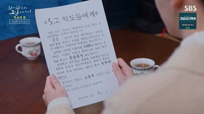 교장이 학생들 앞에서 선생님을 욕하고 때리는 게 말이 돼? 아이들 사이에서는 교장에 대한 흉흉한 목격담이 퍼지고 있었어. 그 내용이 고스란히 세 학생들이 만든 유인물에 담긴 거야.