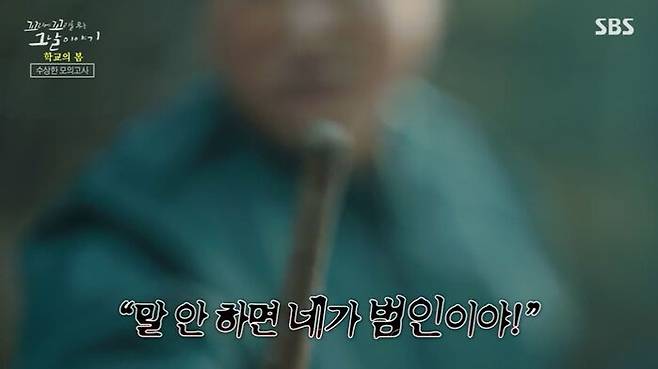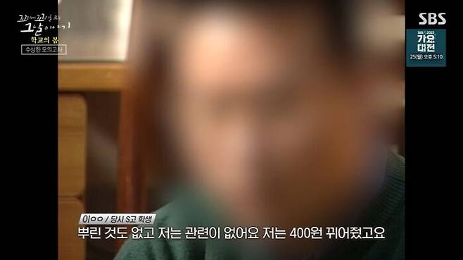 "뿌린 것도 없고 저는 관련이 없어요. 저는 400원 꿔줬고요. 한 10명이 꿔줬는데, 제가 가장 조금 꿔준 거고요. 저희 학교는 때려도 그냥 회초리로 때리는 것도 아니고, 야구방망이로 완전히 이렇게 깔아놓고 때리기 때문에 그걸 맞기가 싫으니까. 제가 안 한 것도 인정하게 되고, 그 앞에서 벌벌 기는 거예요… 저희들한테 그러더라고요. '너희는 내 도장 없으면 검정고시도 못 본다' 말은 쉽지 검정고시도 못 보면, 제 인생은 완전히 밑바닥으로 깔려버리는 거예요. 저에게는 엄청난 일을 저 혼자 감당하기가 정말 힘들었어요. 거의 미쳐버릴 지경까지 갔는데. 그 선생님들이 저에게 한 행동과 그 말들을 저는 잊을 수가 없어요. 진짜…"