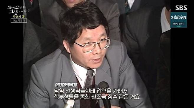 A교장은 학생들이나 학부모들의 고통엔 전혀 관심이 없었어. 심지어 92년 9월엔 교육부가 일체의 찬조금 징수를 금지했는데, 씨알도 안 먹혀. S고의 찬조금 징수는 계속 됐어. 돈을 걷는 명분도, 돈을 걷는 방식도, 전부 담임선생님한테 알아서 하라고 한 거야.