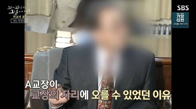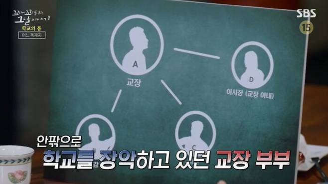 먼저 A교장이 있고, B교감은 교장의 충성스러운 2인자야. C이사는 일종의 협력관계야. 육군 대령 출신으로 안기부를 거쳐 83년부터 이 학교 재단의 상근이사를 맡게 돼. 학교나 교장에게 문제가 생길 때마다 해결사 역할을 했던 걸로 보여. 마지막으로 이 학교의 D 재단 이사장. A교장의 아내야. 부부가 안팎으로 학교를 꽉 잡고 있던 거지. 그런데 이 부부는 한때 세간의 주목을 받은 적이 있어.