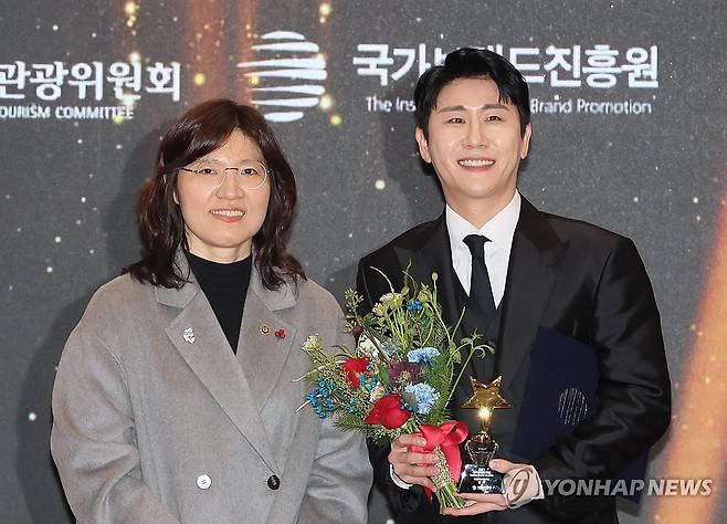 (서울=연합뉴스) 이정훈 기자 = 가수 영탁이 15일 국회 의원회관 열린 2023 제7회 국가브랜드컨퍼런스 '국가브랜드대상' 시상식에서 대중문화부문 대상을 수상한 뒤 시상자인 장미란 문화체육관광부 차관과 포즈를 취하고 있다. 2023.12.15