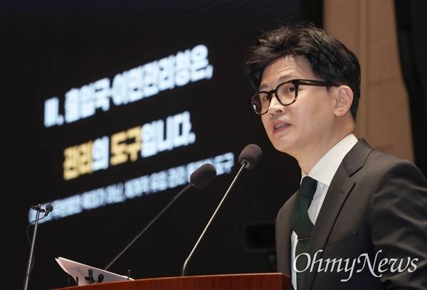| ▲ 한동훈 법무부 장관이 6일 서울 여의도 국회에서 열린 국민의힘 정책의원총회에 참석해 '출입국 이민관리청 신설 방안'에 대해 제안설명을 하고 있다. |