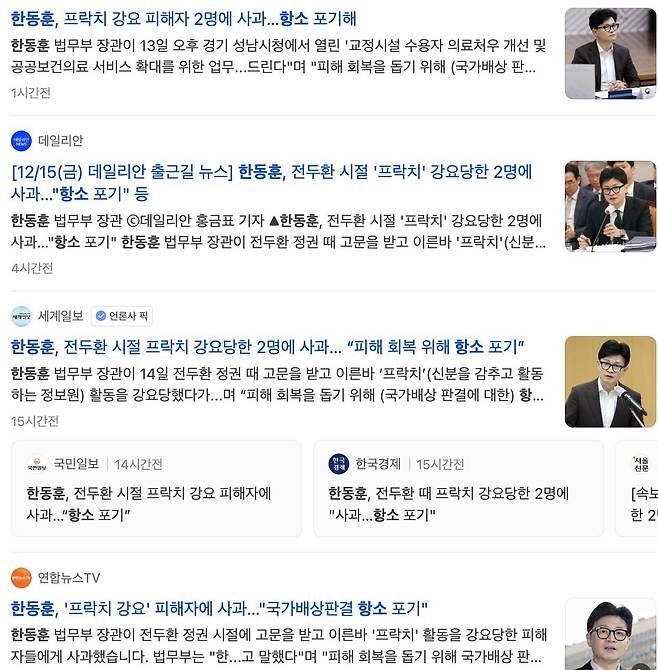이날 보도자료 배포 후 언론에는 '한동훈 장관, 프락치 강요 피해자 2명에게 사과'라는 비슷한 제목의 기사가 쏟아졌다. 기사 댓글에는 법무부와 한동훈 장관의 항소 포기와 관련해 환영의 글이 다수 달렸다.