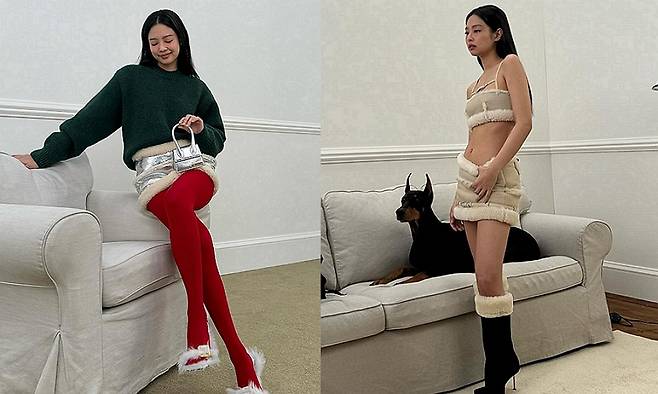 사진 속 제니는 빨간색 스타킹과 은색 미니 스커트, 그리고 녹색 니트를 매치해 크리스마트 트리 같은 스타일링을 선보였다. 또 다른 사진에서는 크롭탑을 입고 늘씬한 몸매를 자랑하는 제니의 모습이 눈에 띈다.