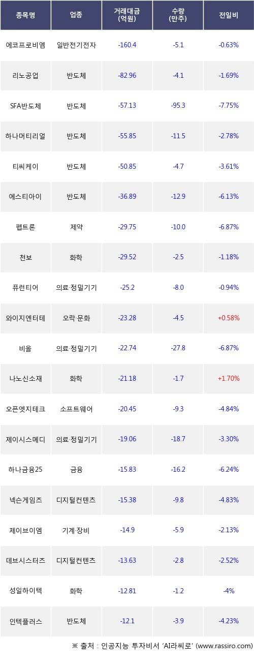 기관 투자자의 순매도 상위 20개 종목은 에코프로비엠, 리노공업, SFA반도체, 하나머티리얼즈, 티씨케이, 에스티아이, 펩트론, 천보, 퓨런티어, 와이지엔터테인먼트등이다.