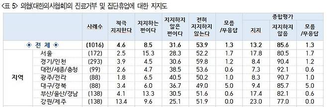 대한의사협회(의협)가 이날까지 파업(집단 진료 거부) 여부를 묻는 찬반투표를 실시하는 가운데, 응답자의 85.6%는 "의협이 진료거부 또는 집단휴업에 나서는 것을 지지하지 않는다"고 했다. 또 71.9%는 "정부의 의대증원에 반대하는 의협의 입장을 지지하지 않는다"고 생각을 밝혔다. 의협은 이날 서울 광화문에서 의대증원에 반대하는 집회를 계획하고 있다.