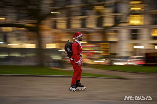 [런던=AP/뉴시스] 16일(현지시각) 영국 런던에서 열린 '산타 스케이트'의 한 참가자가 대회 시작 전 몸을 풀고 있다. 열여덟 번째 열린 이 연례행사에 100명 이상의 참가자가 산타클로스 옷을 입고 거리로 나왔다. 2023.12.17.