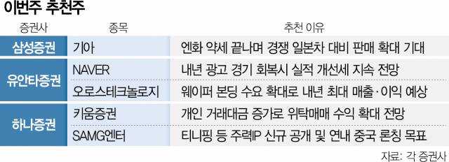 엔화 약세가 막을 내릴 것으로 예상되면서 국산 자동차의 글로벌 가격 경쟁력이 개선될 것으로 기대돼 기아(000270)가 이번주 추천주로 제시됐다. 실적 개선이 기대되는 네이버(NAVER(035420))와 키움증권(039490) 등도 추천주 목록에 올랐다.
